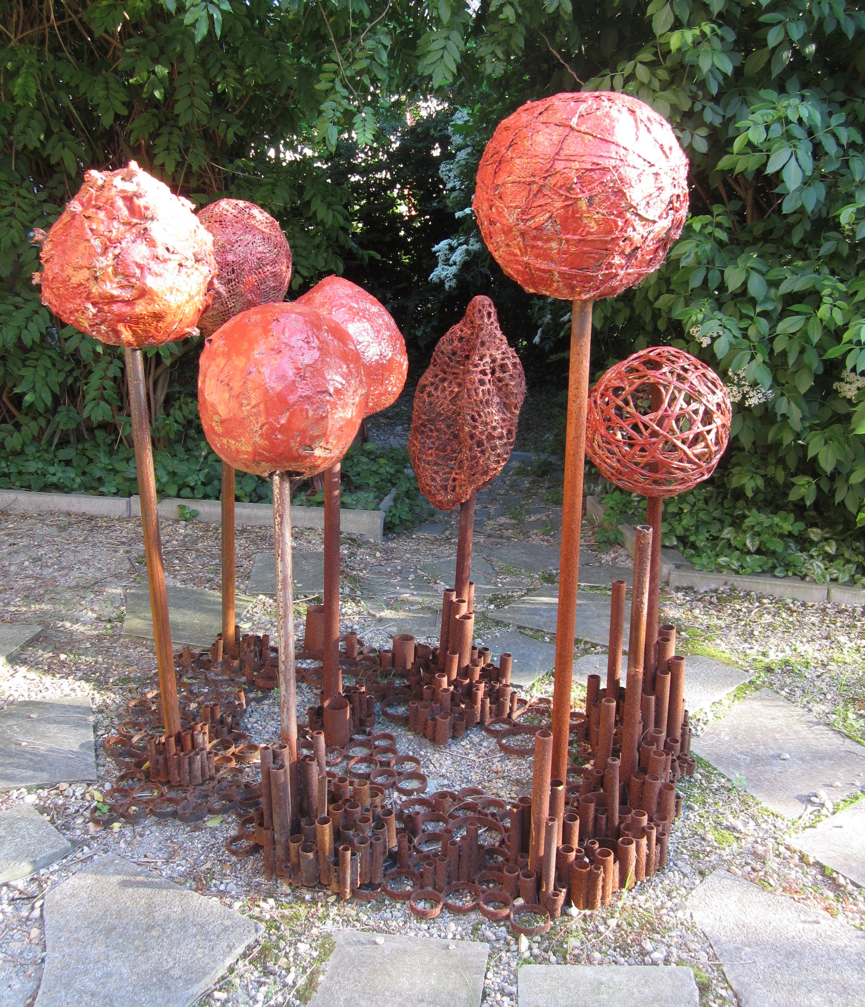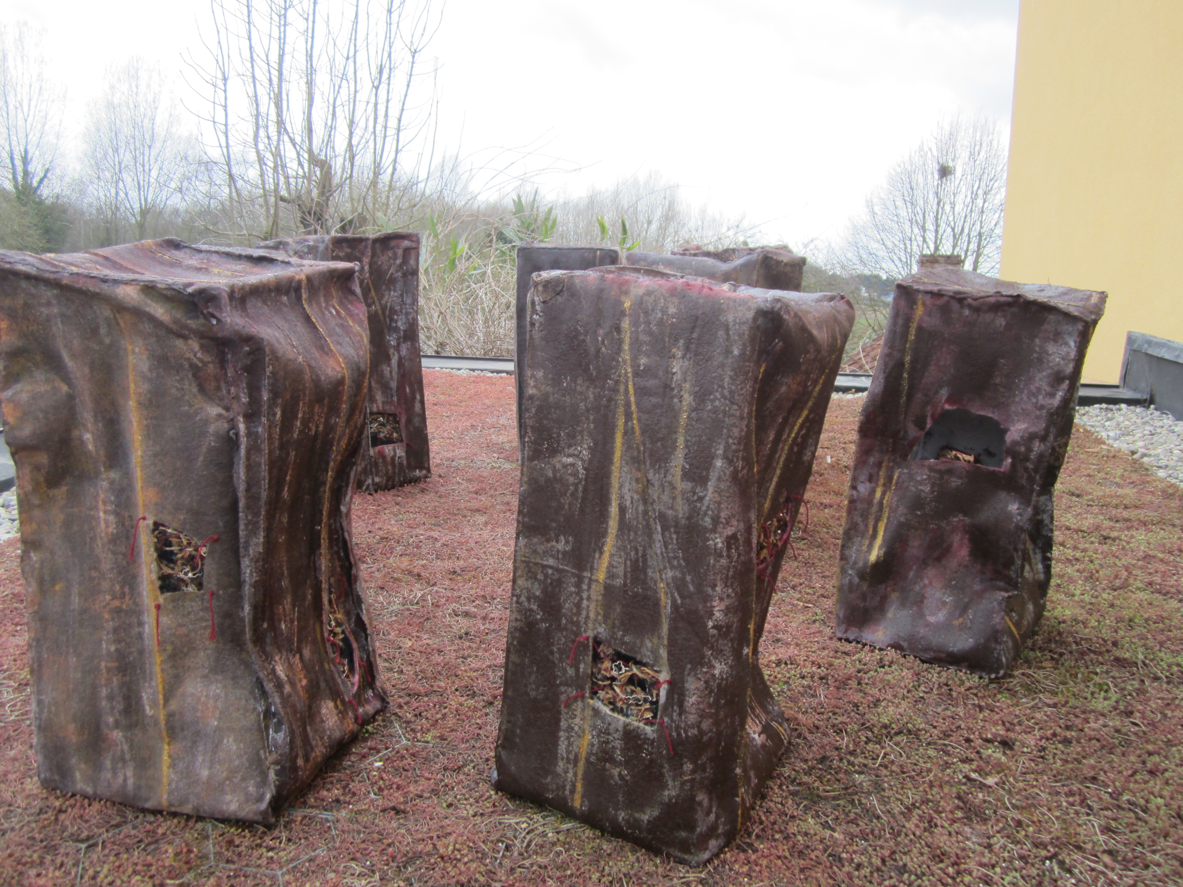 The rain fall far from us 2014: Inspiratie Hundertwasser. Textiele materialen verhard met polyster, gips, powertex, compactuna gemonteerd op gelaste ijzerbuizen
