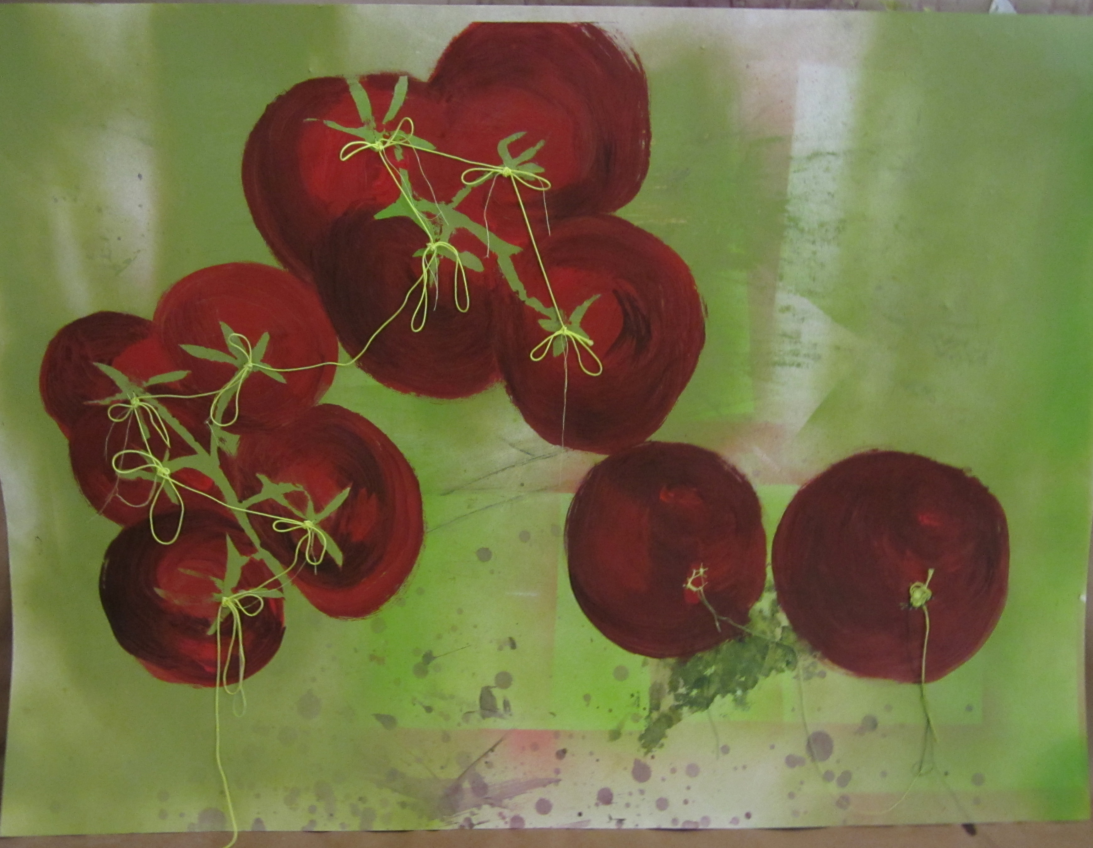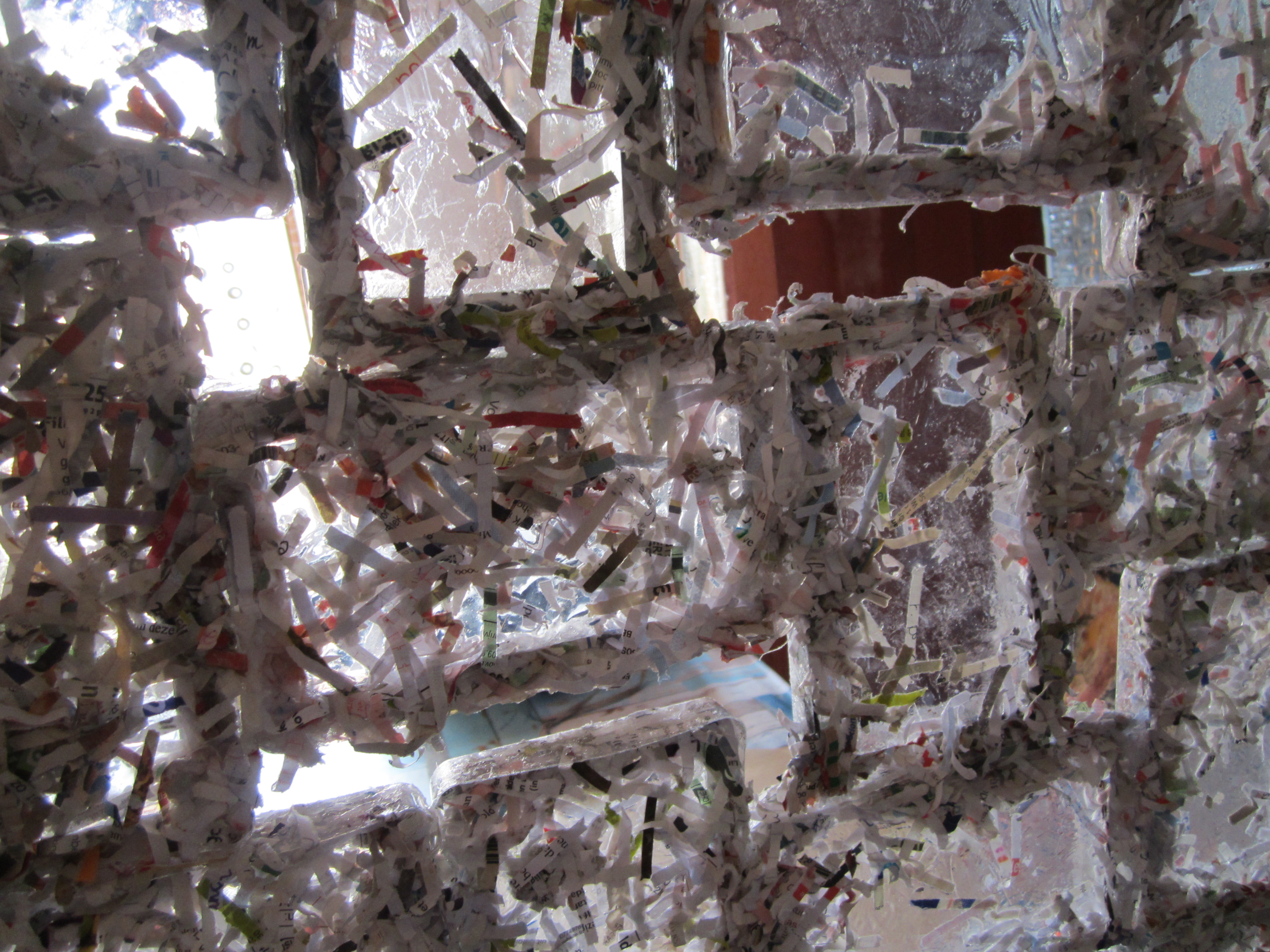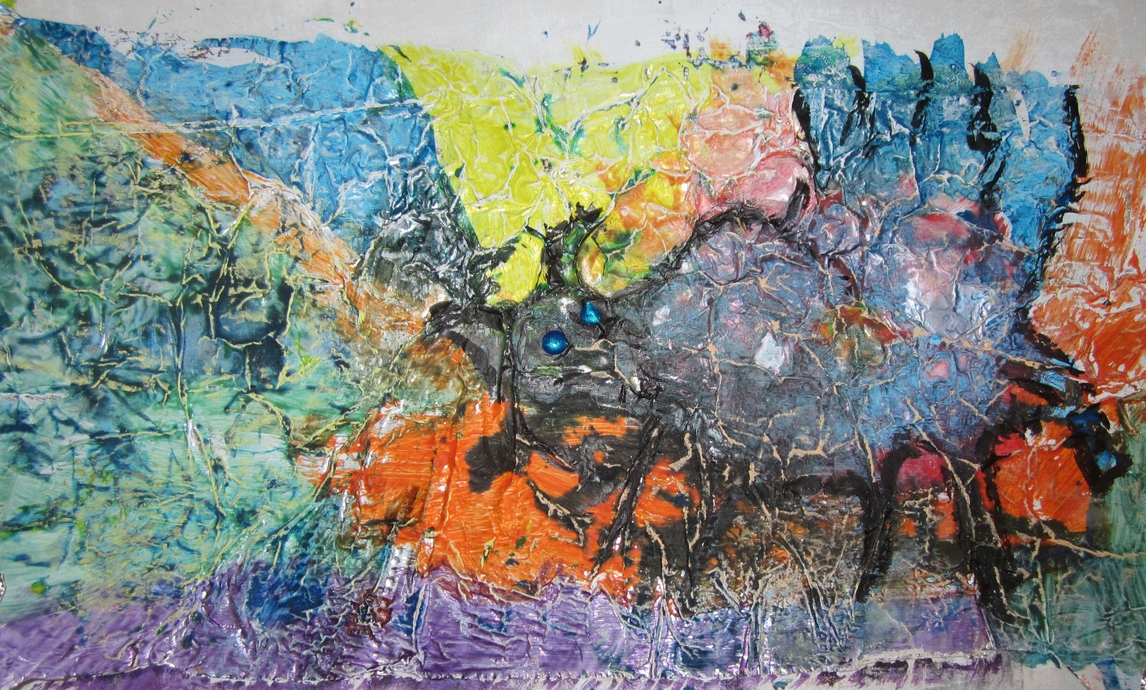 Experiment: zilverpapier, lijm, papier, acryl, plakkaat, textielverven, houtskool, krijt, nagellak, haarlak.