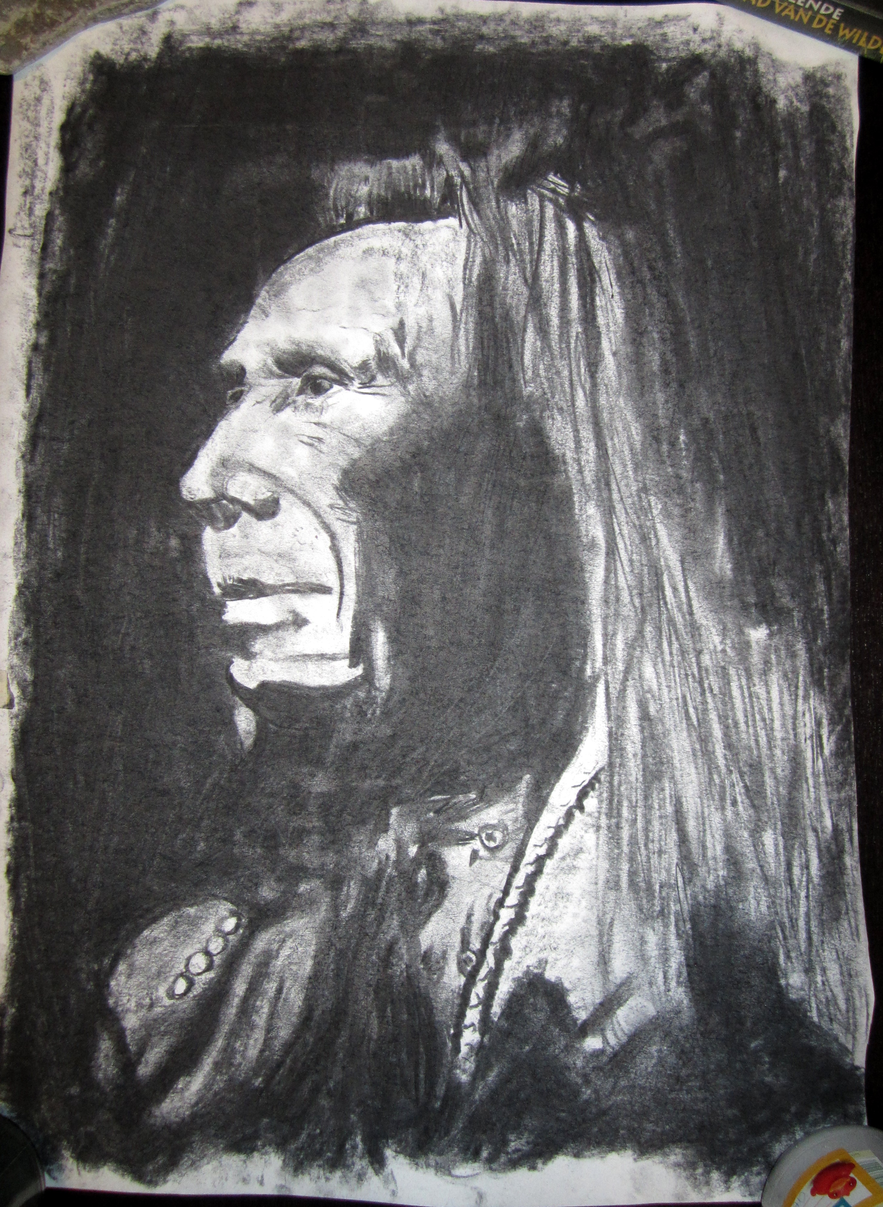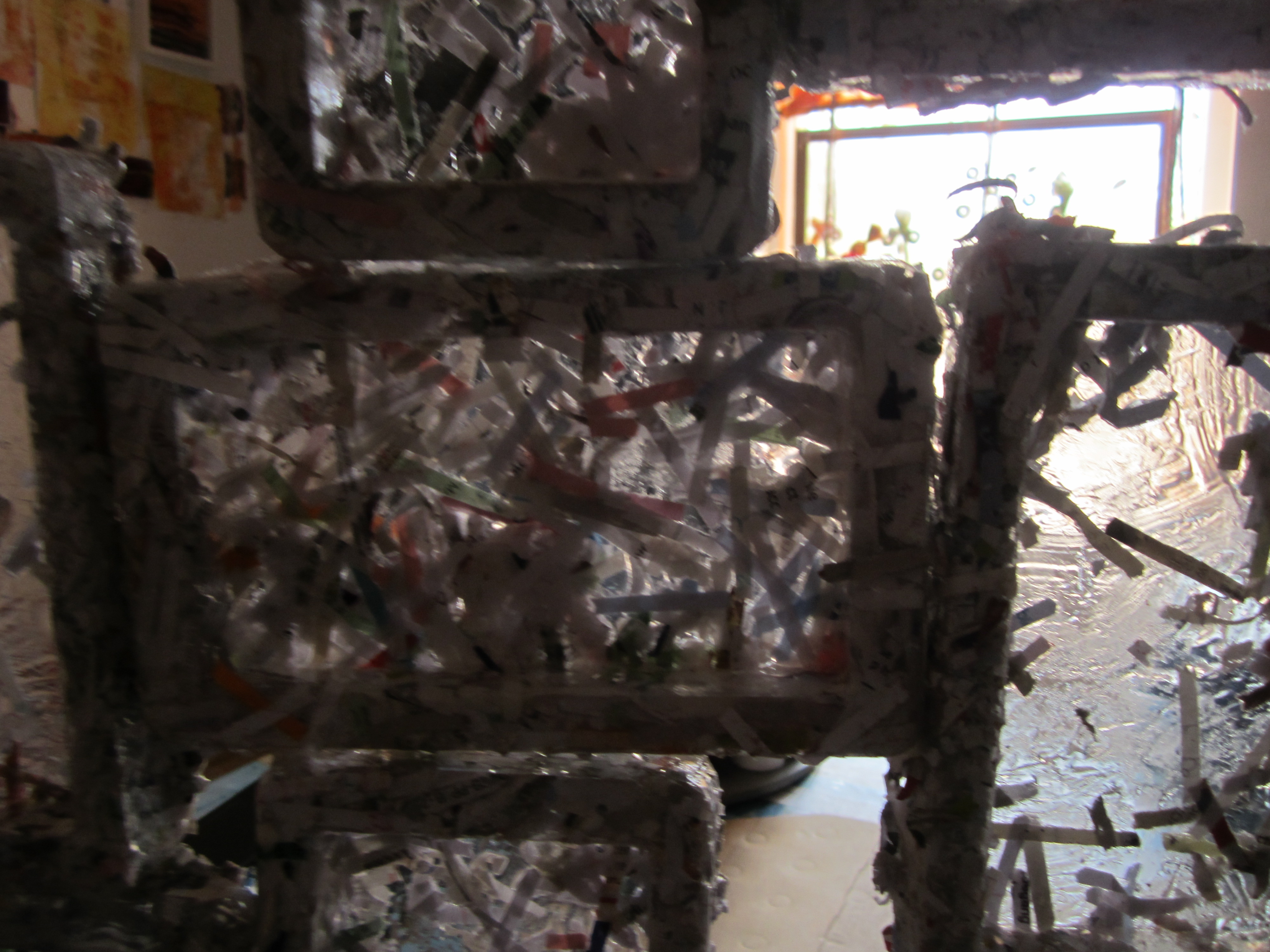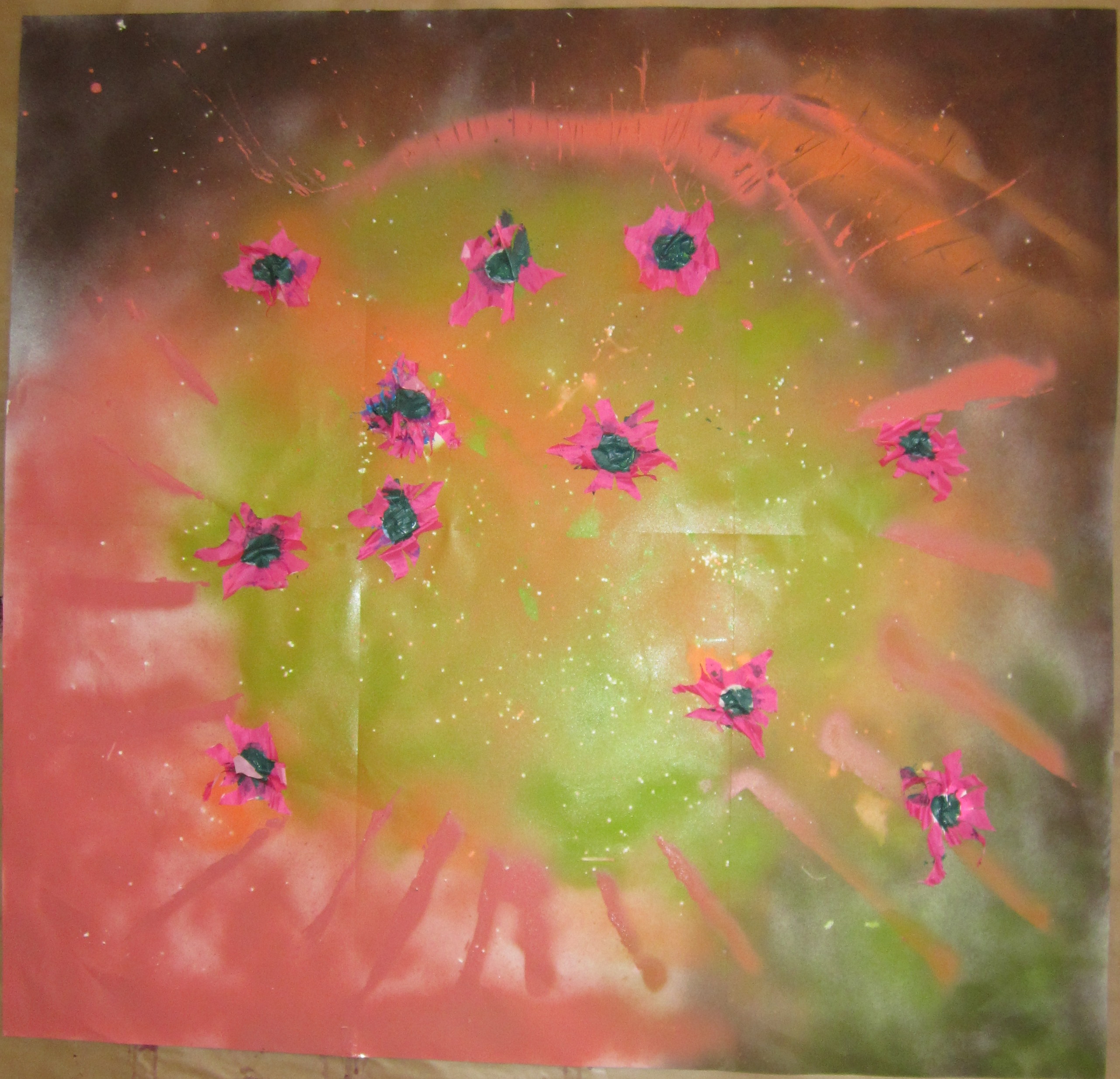 Experiment: zilverpapier, lijm, papier, acryl, plakkaat, textielverven, houtskool, krijt, nagellak, haarlak.
