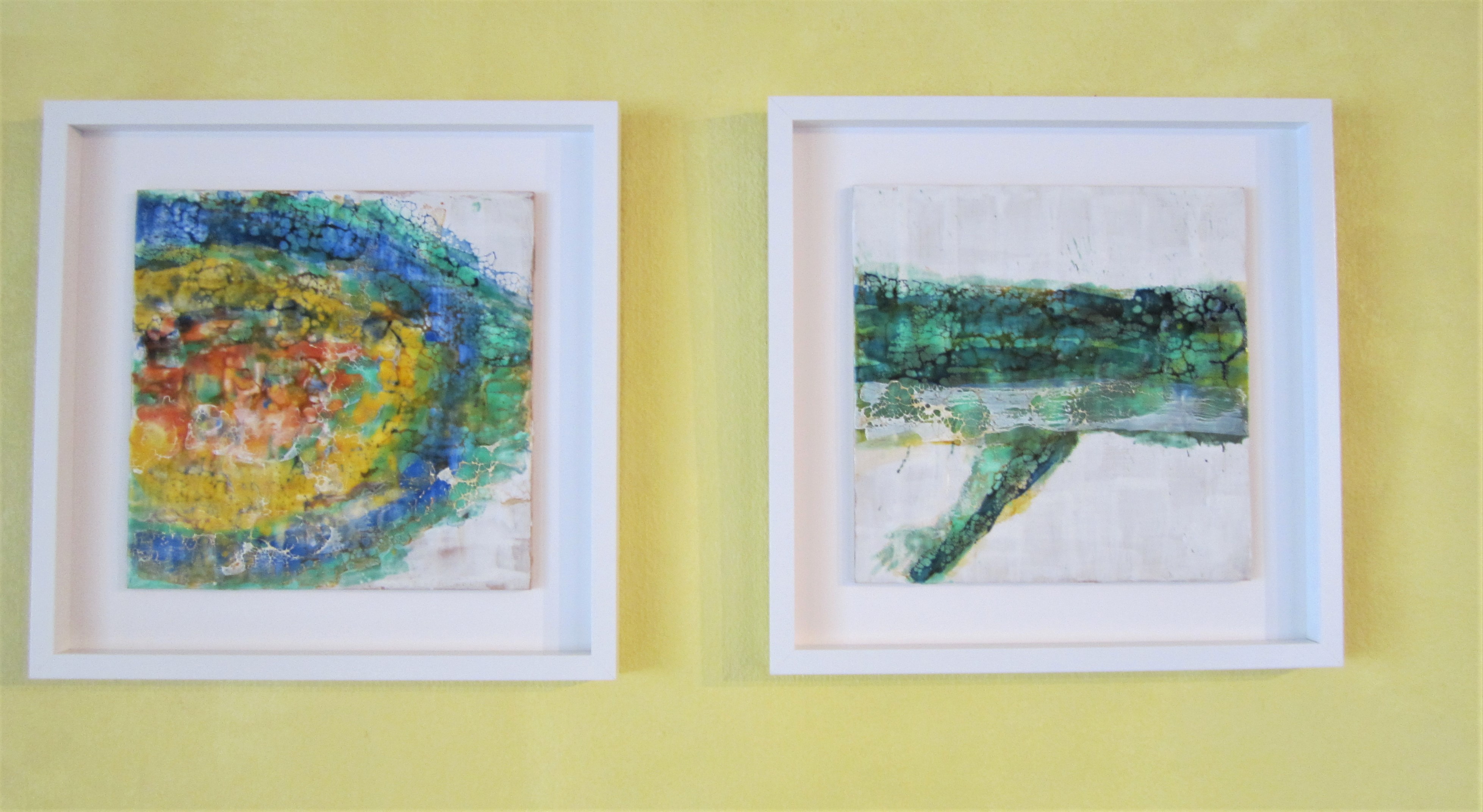 2020 Bijenwas verschillende lagen, tegen muur geverfd met rest verf wit+kurkuma.