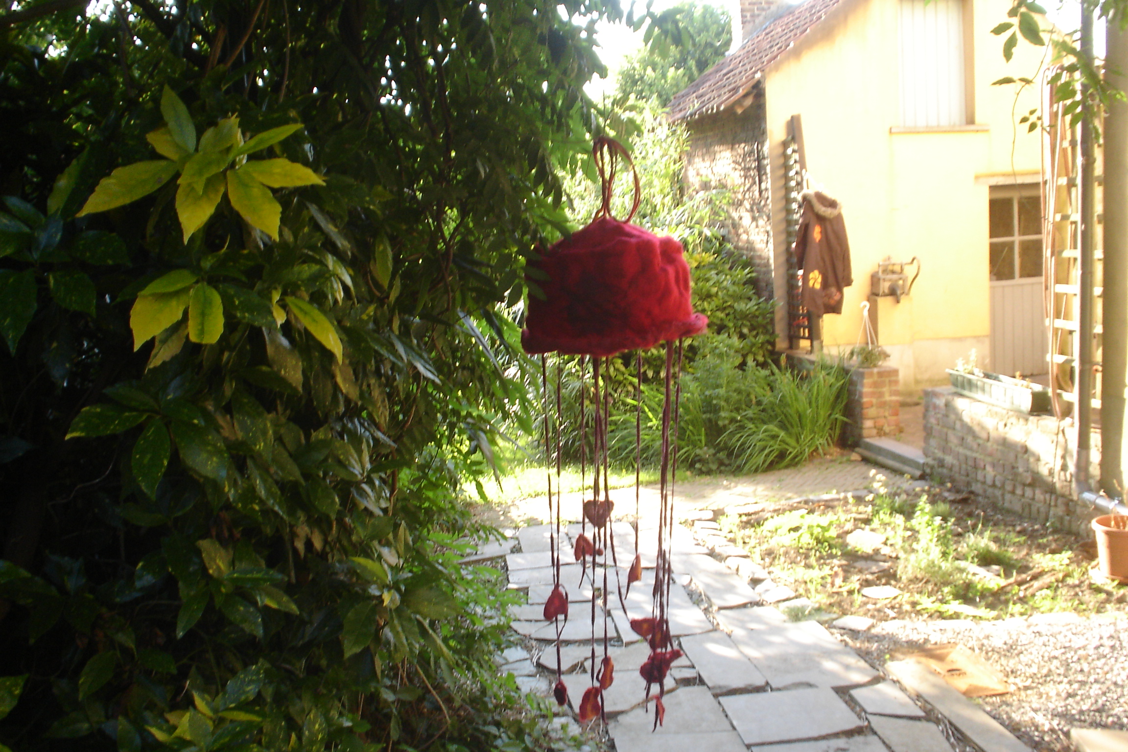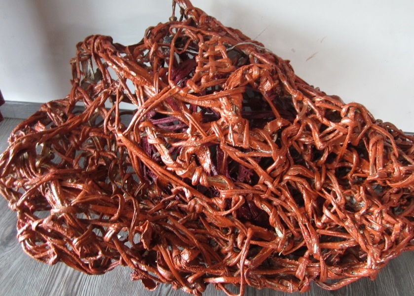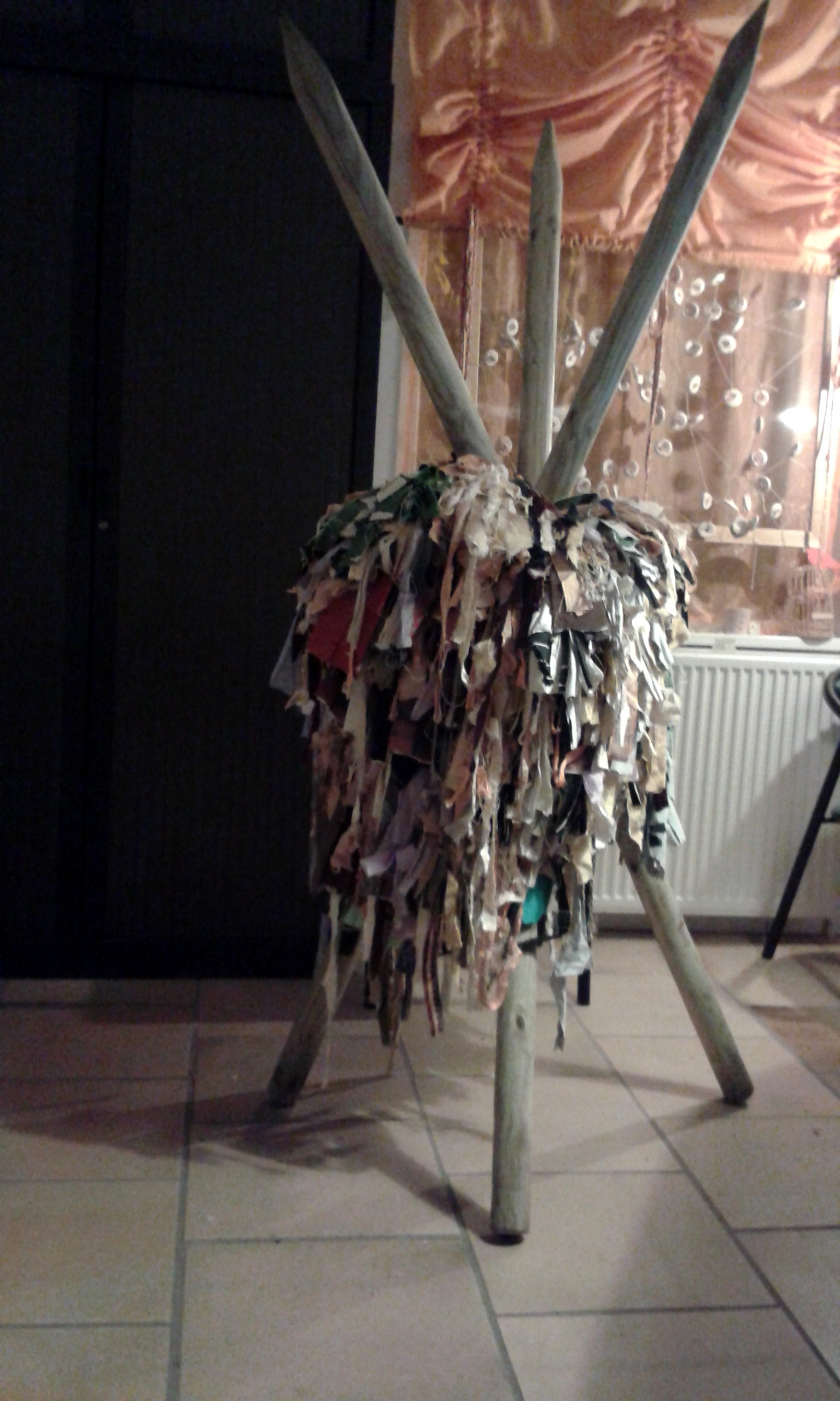 The rain fall far from us 2014: Inspiratie Hundertwasser. Textiele materialen verhard met polyster, gips, powertex, compactuna gemonteerd op gelaste ijzerbuizen