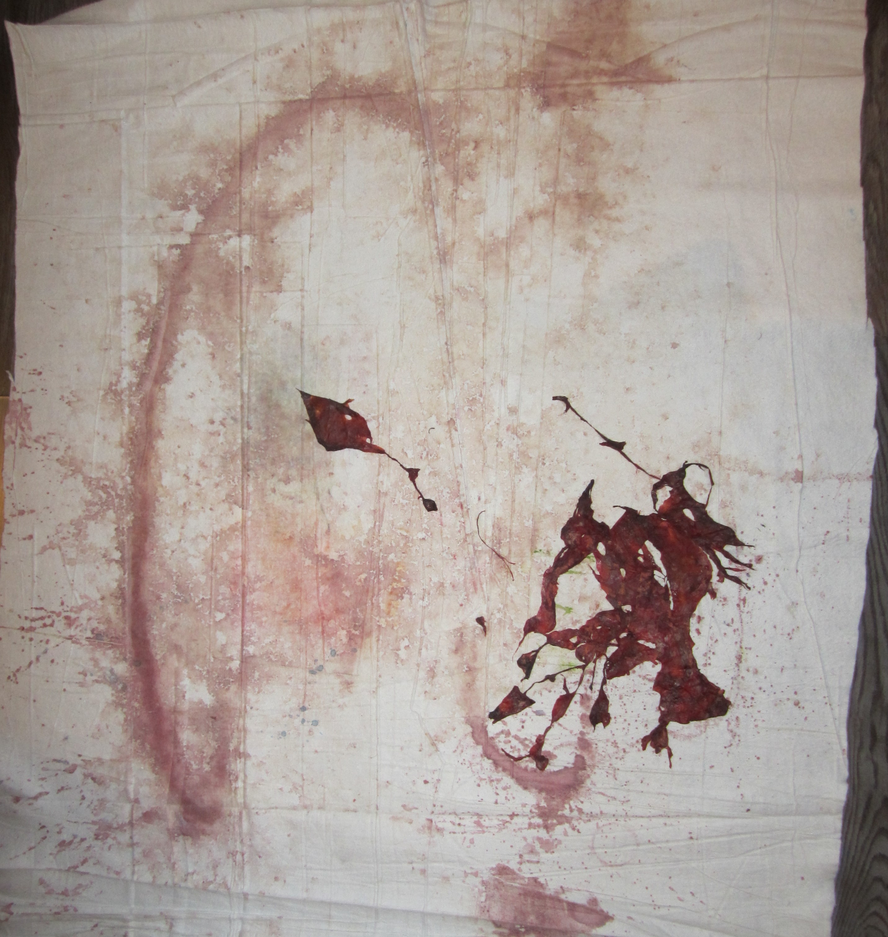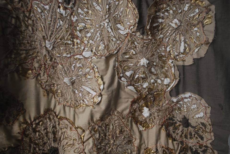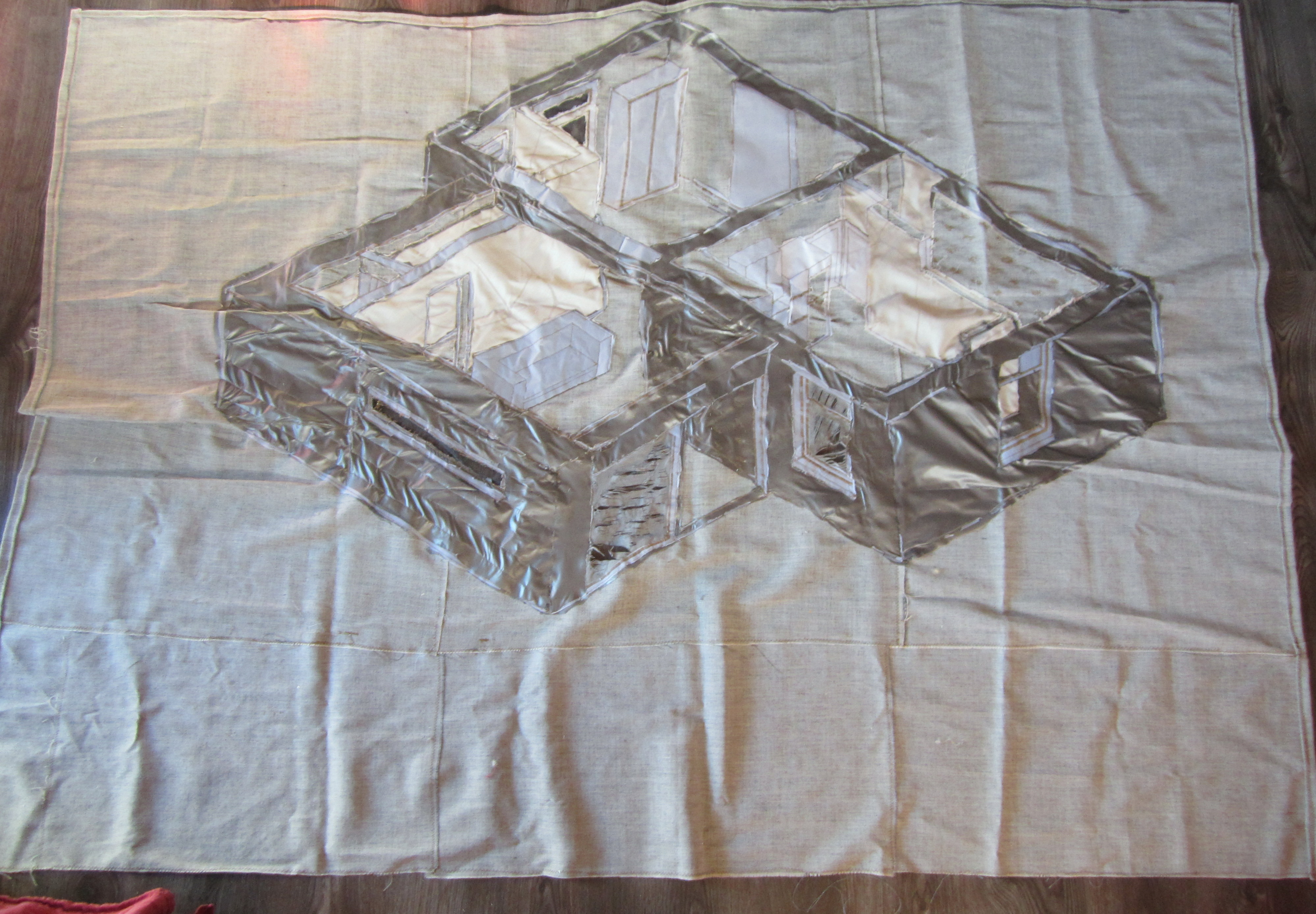 Gedeukt wonen 2016: woonvormen uit textiele materialen, veel verharder, acrylverf, textielverf en restanten van tapijten.
