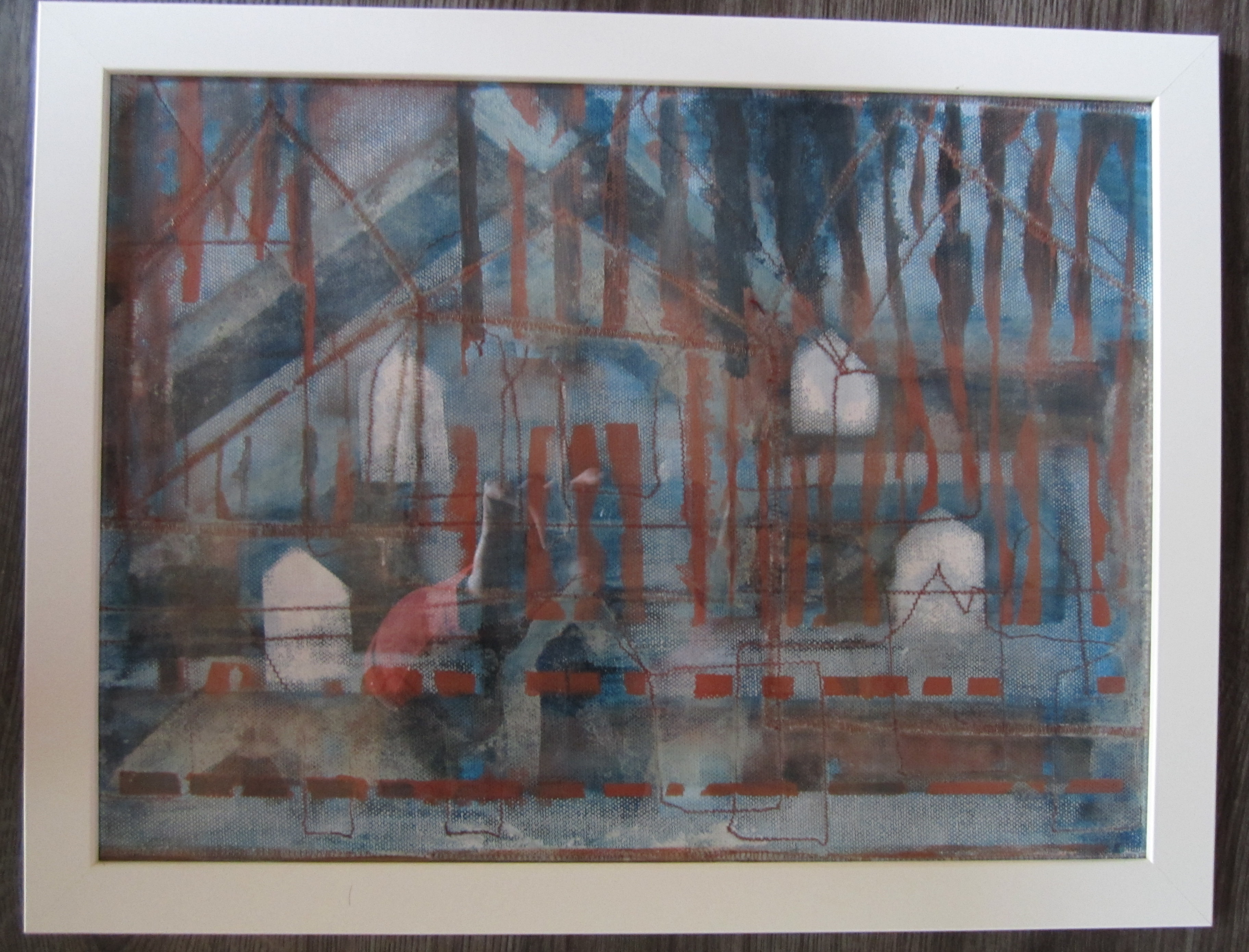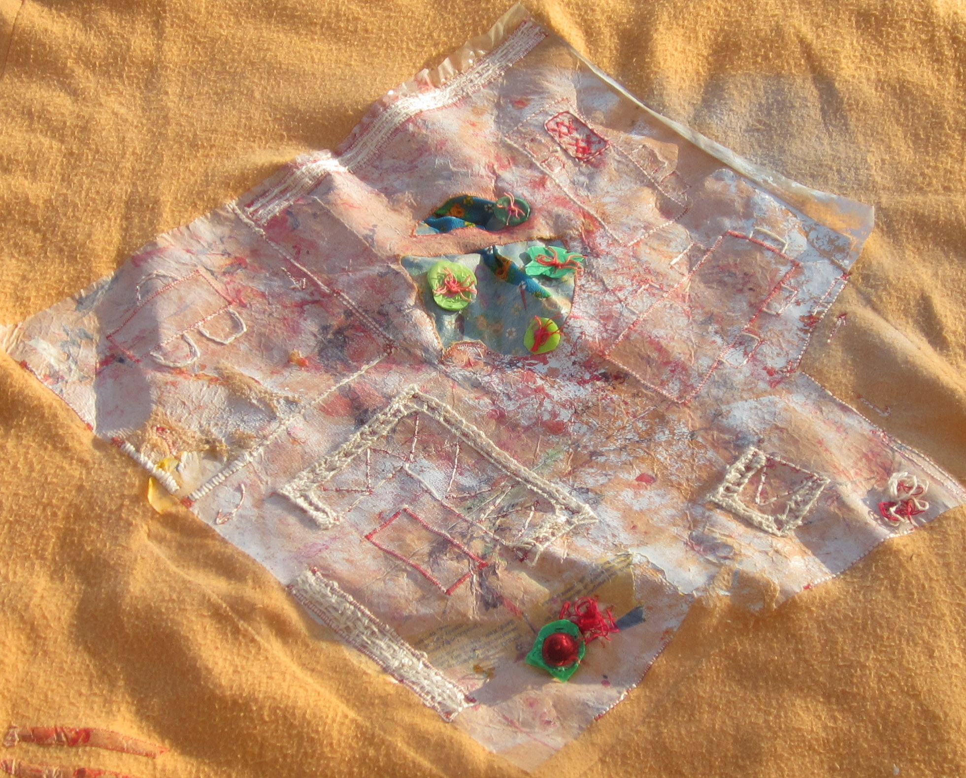Huizen 2012: Afmetingen 28 op 38 cm. Schilderen en naaien op canvas